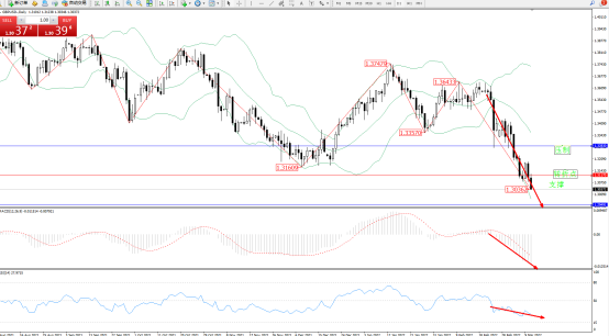 空头动力延续布林带指标下轨附近强势下探态势良好,布林带指标呈收口走势持续中,短期跌势未见有止步迹象,上方压制关注1.32830附近,低位支撑关注1.29491附近,关注1.31170附近转折点,MACD指标处于空头区域不断震荡下挫中,RSI指标处于空头区域维持整理持续下行,如图: