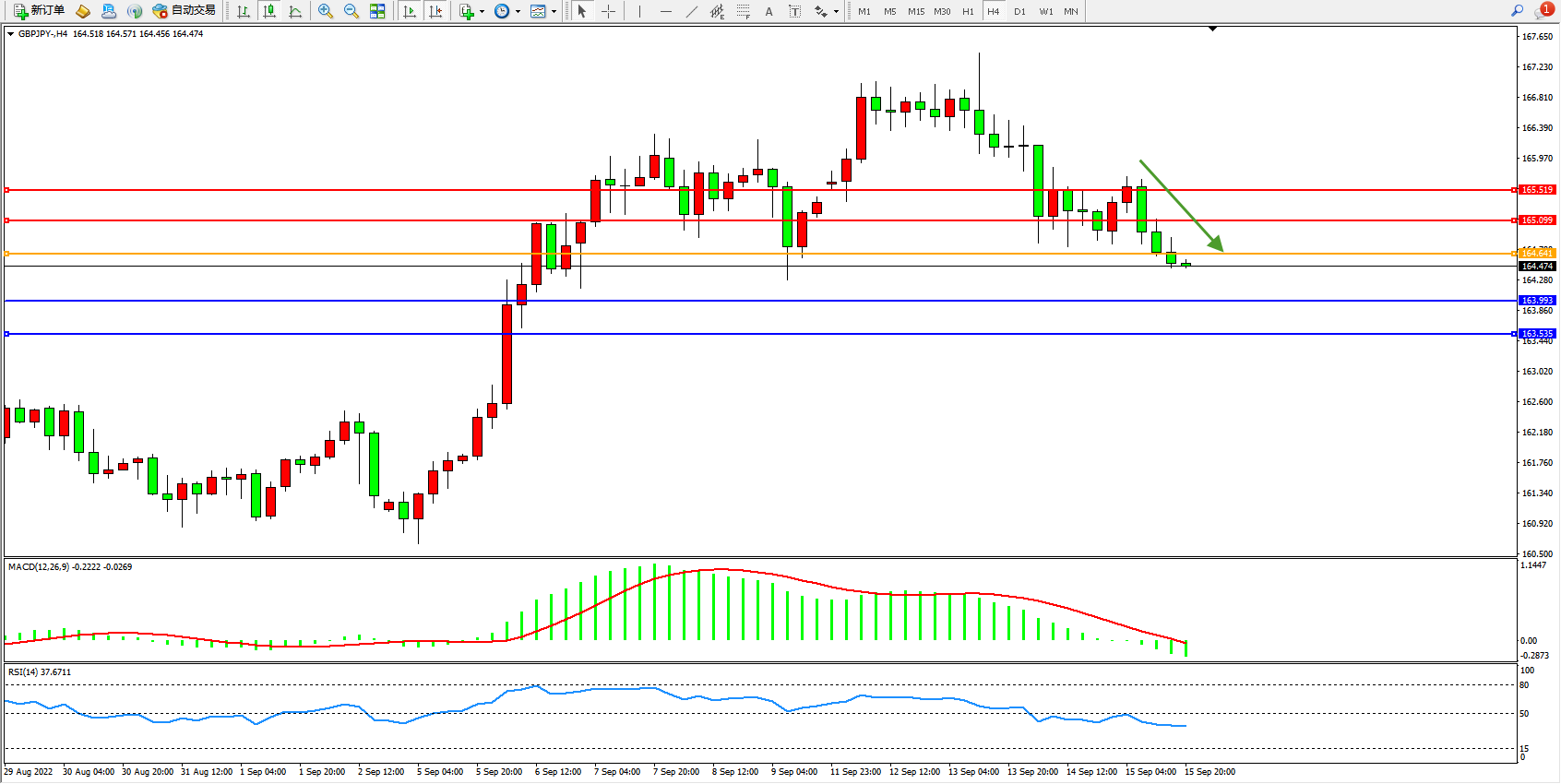 交易策略:164.641下方看跌,目标163.993、163.535