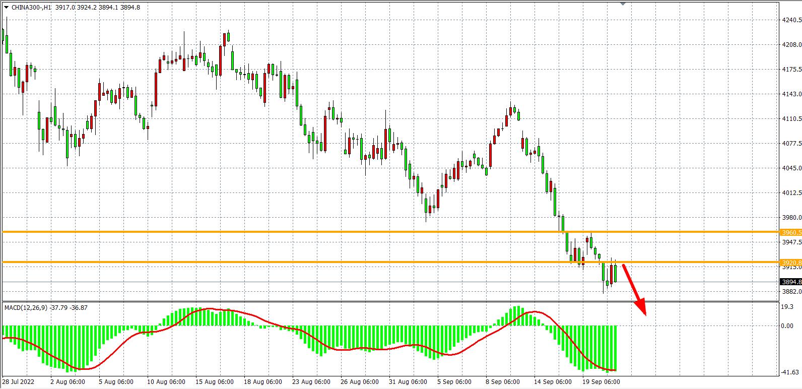 1小时图看,沪深300再度反弹受阻,目前阻力位已下移至3920附近,同时MACD在零轴之下持续放量,趋势延续空头下跌为主。