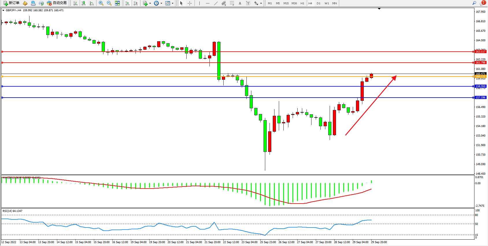 英镑日圆GBPJPY——4小时K线图显示:
