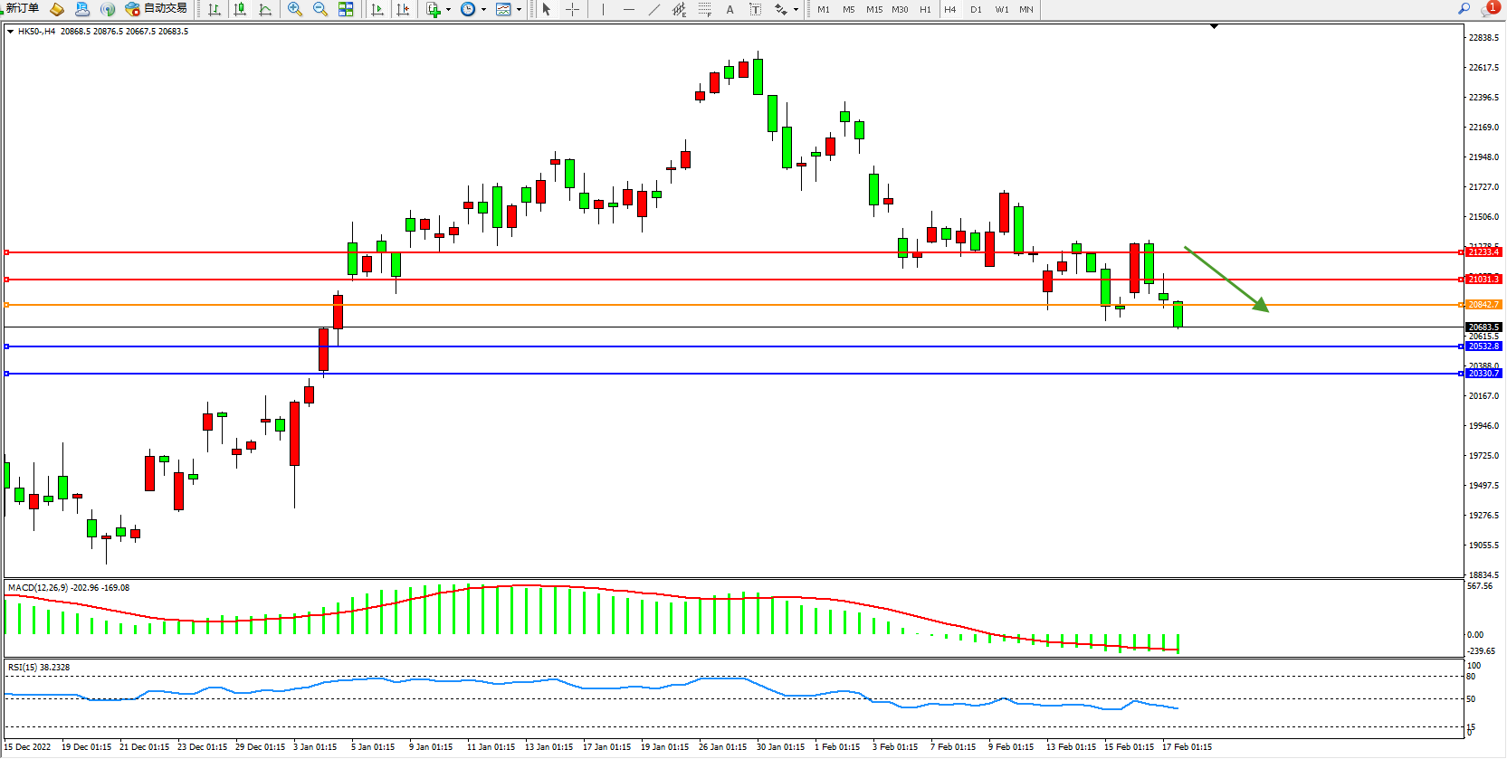 香港恒生指数2月17日(周五)收盘下跌267.86点,跌幅1.28%,报20719.81点;美加息预期升温,市场风险偏好降低,港股全天呈单边下跌行情,恒生科技指数跌2.51%领衔走低,恒指、国指分别下跌1.28%和1.39%,本周三大指数继续回调。药品股山东新华制药股份大涨逾26%表现抢眼。南下资金净流入14.1亿港元,大市成交额为897亿港元。