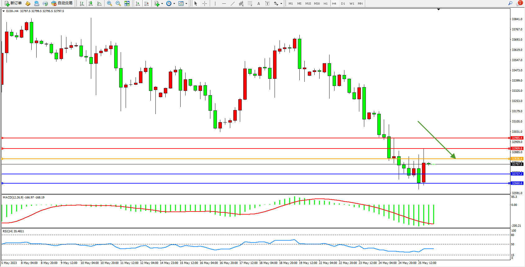 道琼斯指数5月25日(周四)收盘下跌35.20点,跌幅0.11%,报32764.72点;美联储6月政策前景仍将取决于数据和事件,信贷条件收紧将间接帮助美联储完成工作,似没有必要进一步加息。但必须承认,美联储许多人希望看到明确的证据,表明通货膨胀率注定要回到2%。